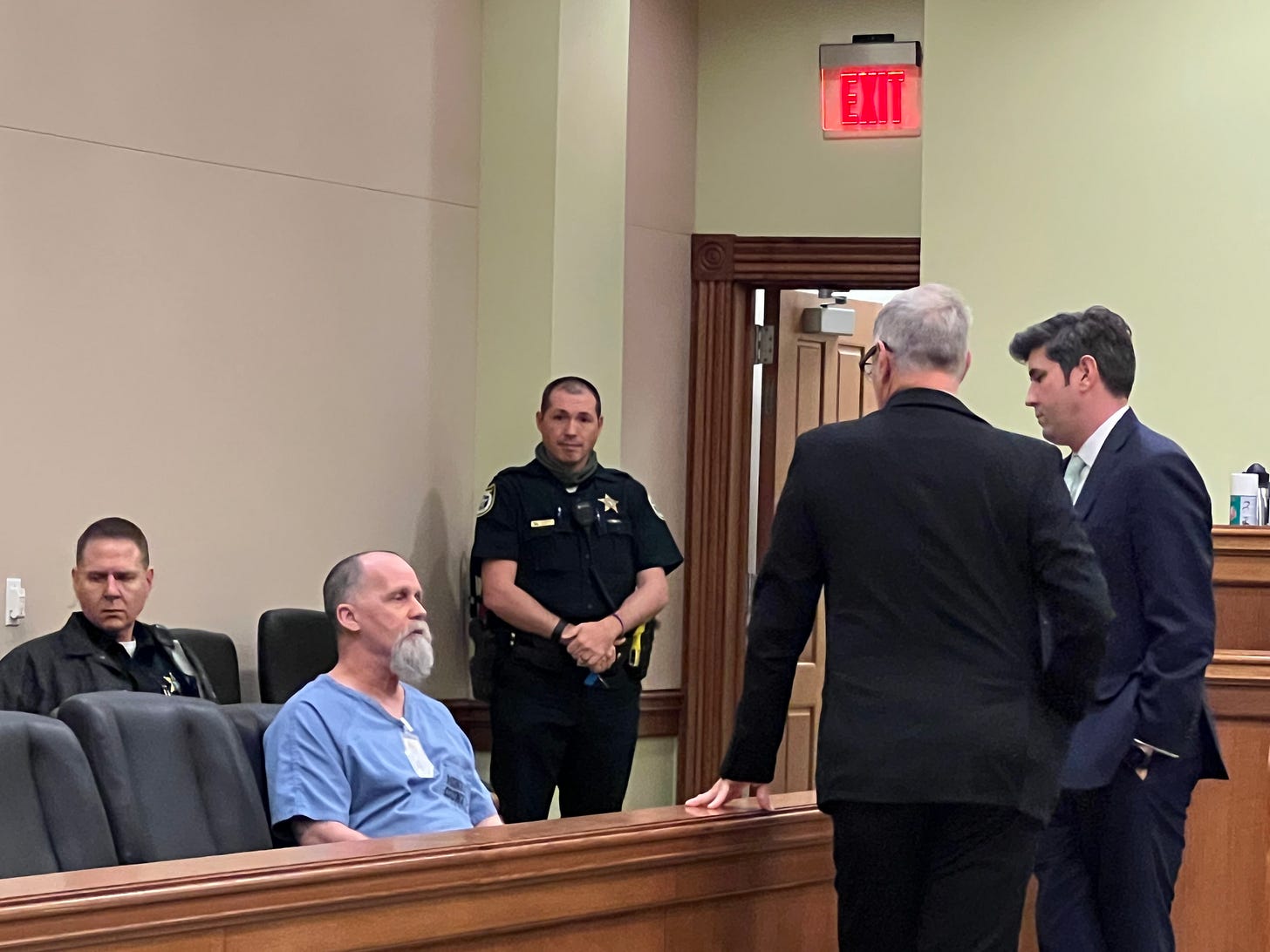 Steven Matthew Wolf speaks with members of the Monroe County Public Defender’s Office while awaiting sentencing for the 2018 murder of Michelle Osborne. / TED LUND
