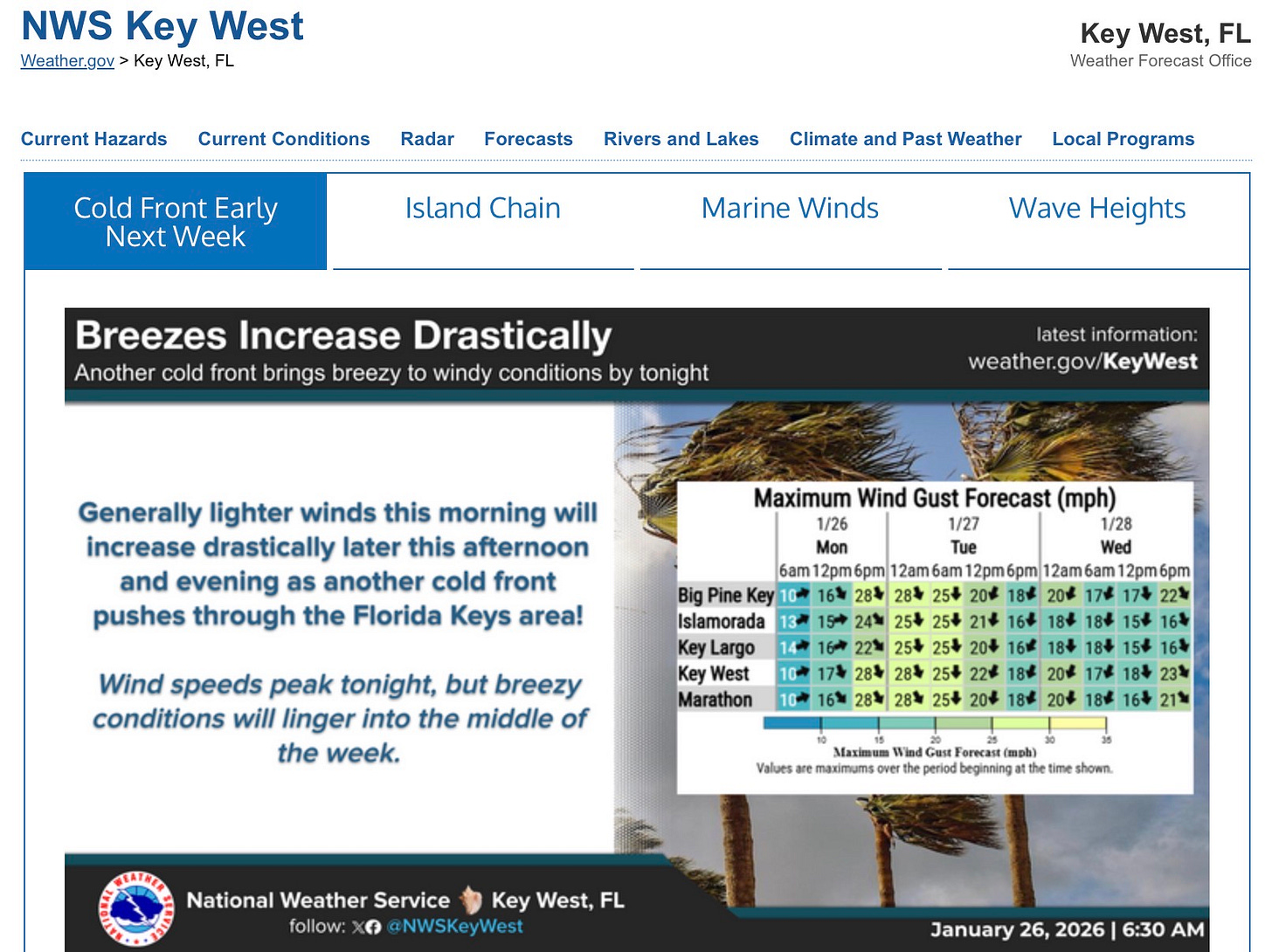 BREAKING: National Weather Service Predicts Small Craft Advisories in Early EveningNWS advises those living in mooring fields or at anchor to make preparations and use caution if traveling by dinghy.Above The Fold By Ted LundJan 26, 2026∙ Paid1ShareFrom the Chris Rothwell at the National Weather Service in Key West:Small Craft Advisory conditions are expected as early as this eveningSustained northwest to north winds will peak at 25 to 30 knots…Continue reading this post for free, courtesy of Above The Fold By Ted Lund.Claim my free postOr purchase a paid subscription.PreviousNext