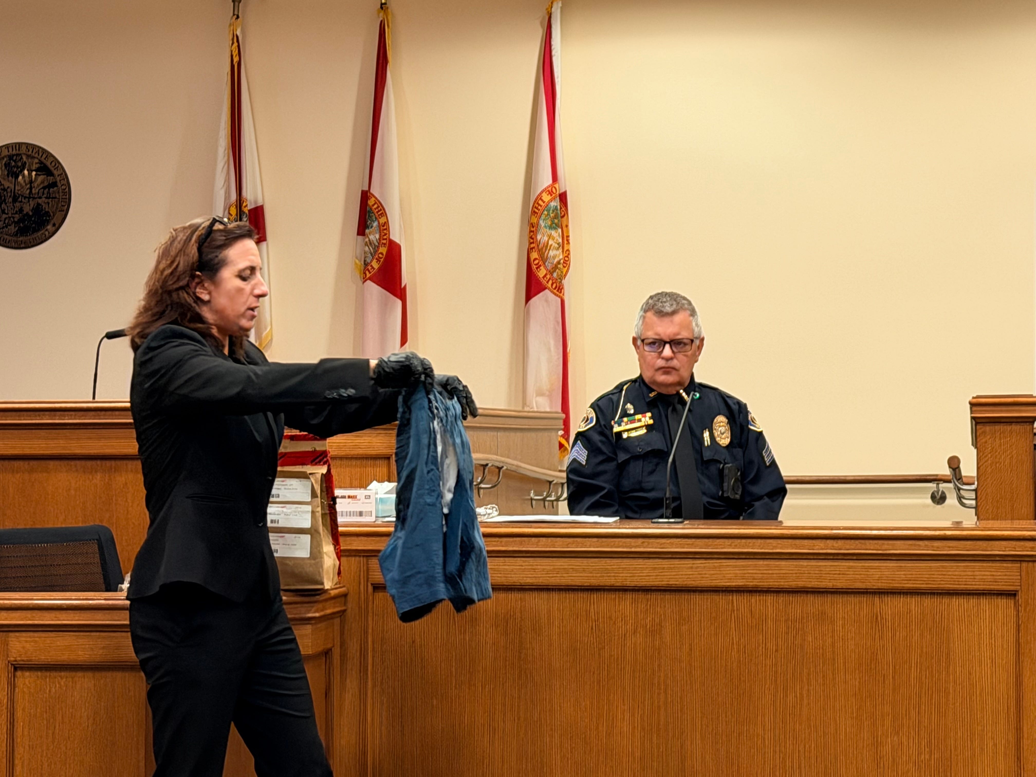 Lead prosecutor Colleen Dunne displays the shorts that were cut off shooting victim Garrett Hugh’s during testimony from the lead KWPD investigator, Sgt. Marcus De Valle. / TEDLUND