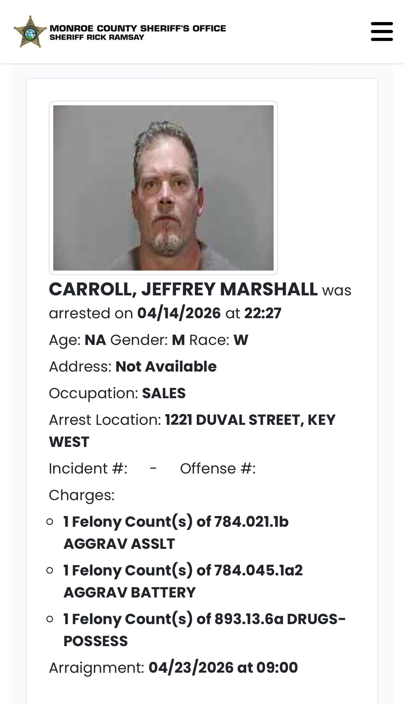 He was booked into the Monroe County jail in Key West, where he remained as of Wednesday with bond set at $65,000 after making his first appearance. An arraignment is scheduled for April 23, according to jail records, with the judge TBD.