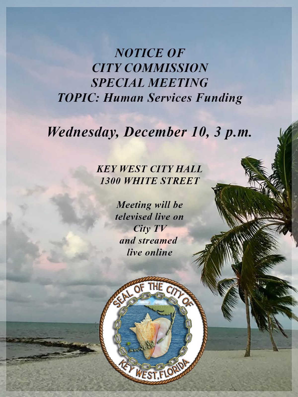 The Key West City Commission has called a special meeting for Wednesday, Dec. 10 at 3 p.m. at City Hall, 1300 White Street, to reconsider emergency “Human Services Funding” after a surge of public outrage over last week’s refusal to support the island’s food pantries. As of 1:40 p.m., the agenda was still not available on the city website.