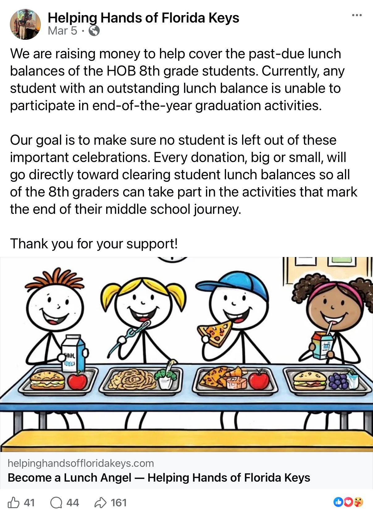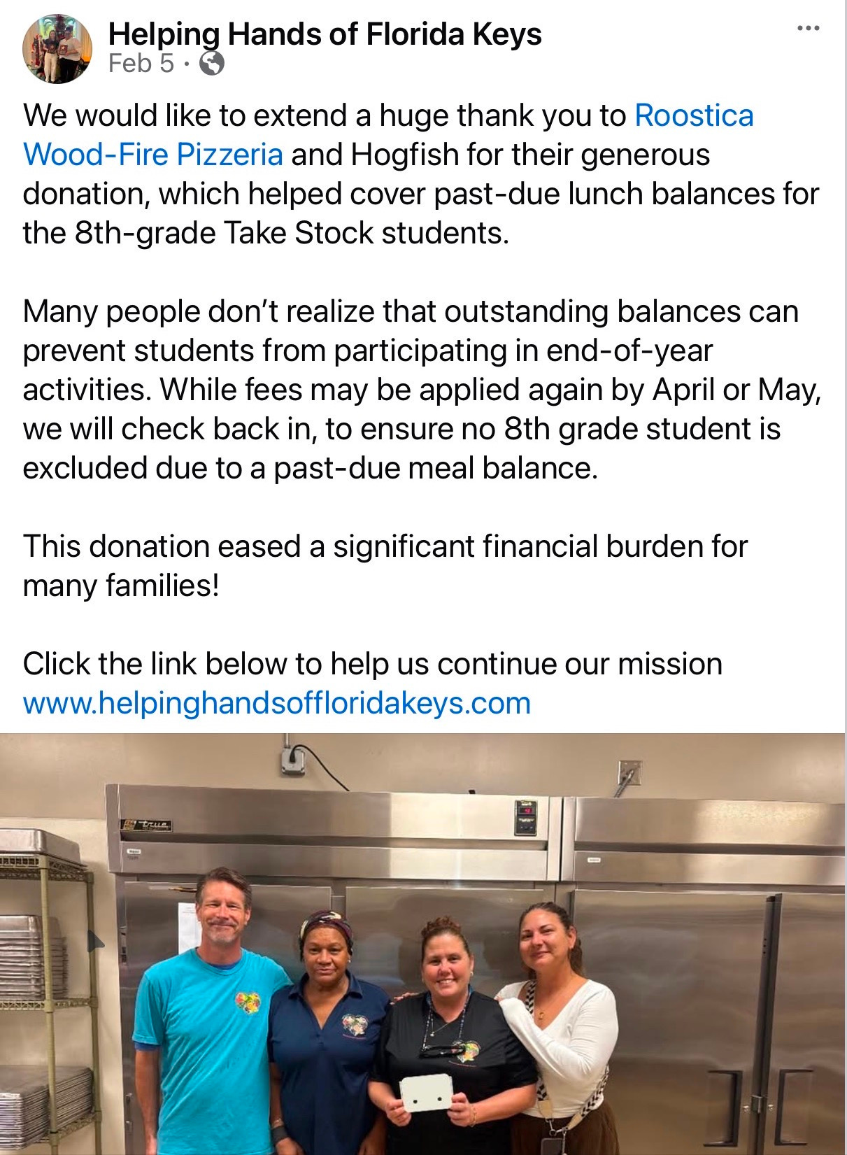 Helping Hands encouraged families who are able to pay their balances to do so, so that donated funds can be directed toward households facing genuine financial hardship. The organization also urged families to apply for free or reduced-price meal programs through the Monroe County School District.
