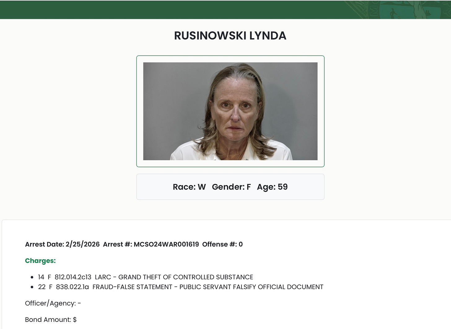 Circuit Judge Mark Jones imposed the sentence following Rusinowski’s no contest plea to 14 counts of grand theft of a controlled substance and three counts of official misconduct. An open plea allows a defendant to plead directly to the court without a negotiated agreement with prosecutors, leaving sentencing to the judge’s discretion.